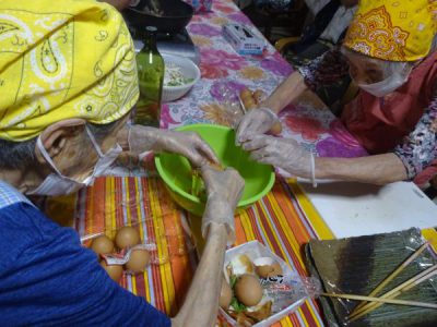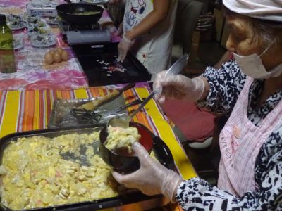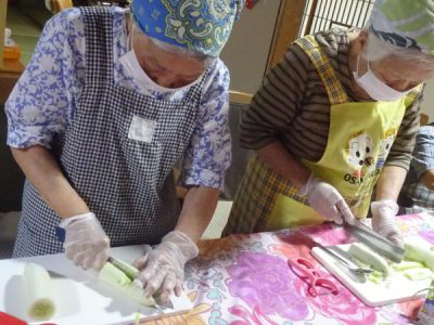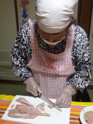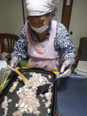 父や母達が協力をして切った野菜や鶏肉を