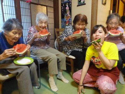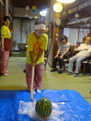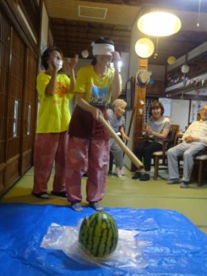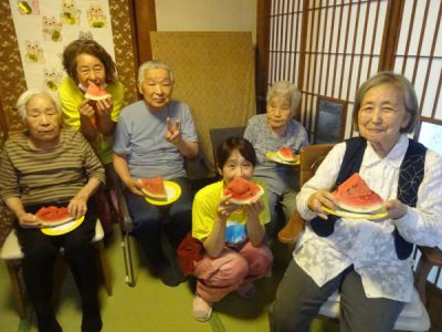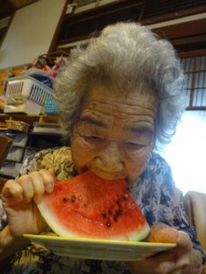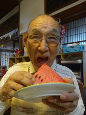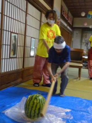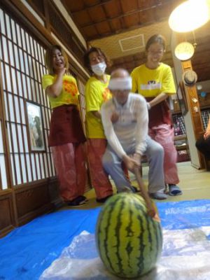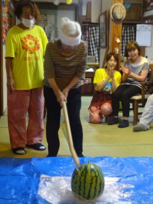 スイカの登場に父や母達、大喜び
