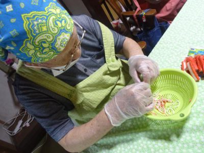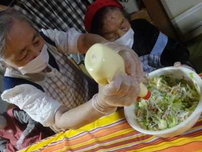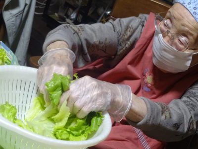 レタスをちぎったり、カニカマをさいたり と