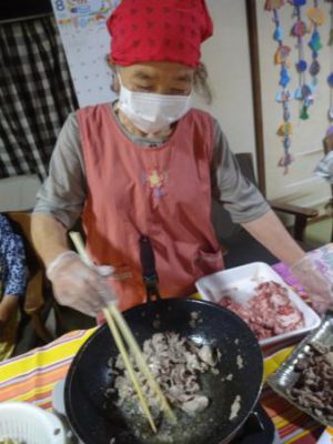 協力して野菜やお肉を炒めていきます