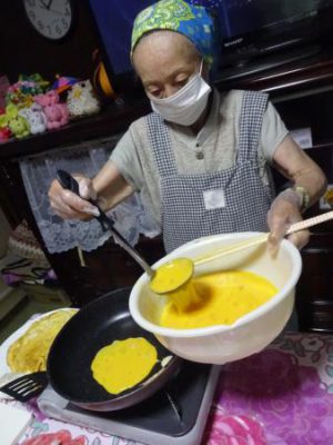 テーブルクロスを引き、エプロン、三角巾、マスク、手袋を