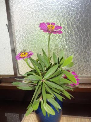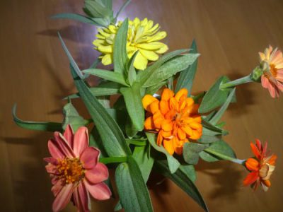 幸望庵の庭で朝に摘んだ 百日草の花が