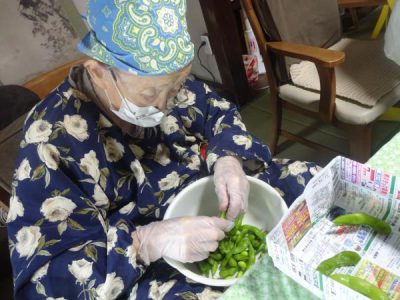 枝豆の皮を剥き、エビと塩昆布で和えていきます★
