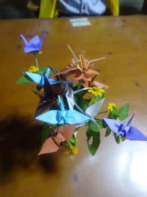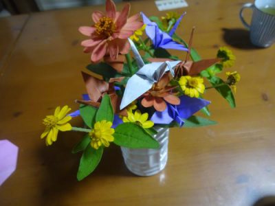 その後、母達の発想によりお花に折鶴を
