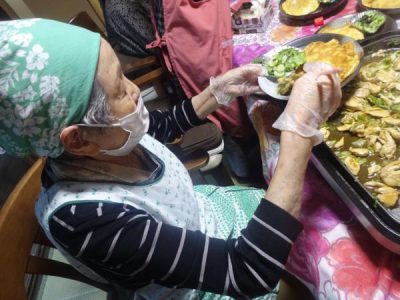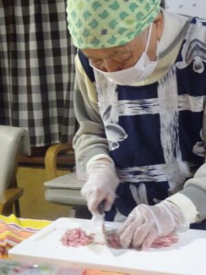 全員、エプロン、三角頭巾、マスク、手袋を着用して、調理開始です