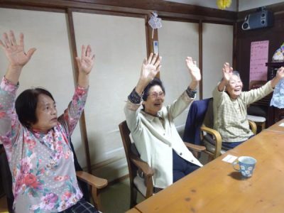 歌謡体操も 大きな声で元気よく行います走る人