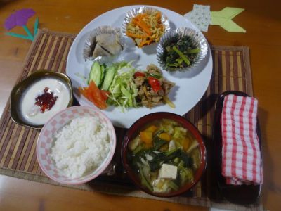 具沢山の味噌汁(白菜、人参、ねぎ、舞茸、油揚げ、ワカメ、豆腐)
