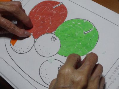 午後は、リンゴとみかんのちぎり絵