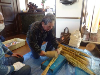 しめ縄作成の為に、事前にわらを叩いて頂きました