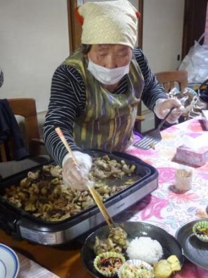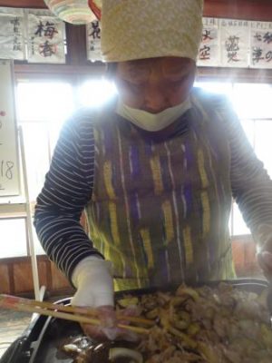 こちらでは 豚肉や揚げ納豆を焼いていきます