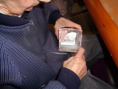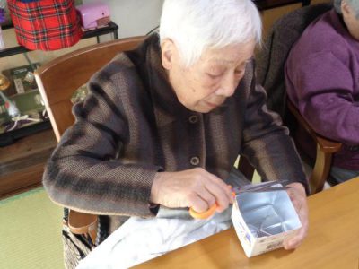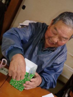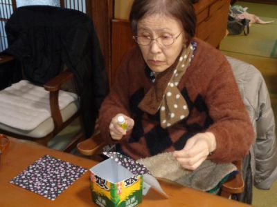 和柄の折り紙を使いパックの回りに丁寧に貼っていきます