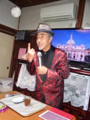 今日は堀口オーナー赤いスーツと黒い帽子で登場