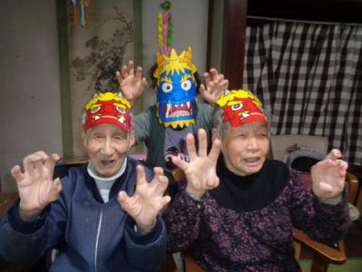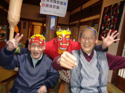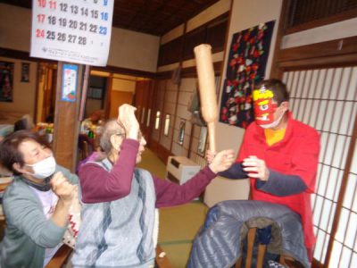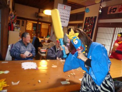 父や母たちは思いっきり豆を鬼にぶつけ~