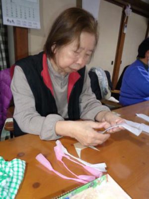 お花紙を手でちぎって、よじっていくので