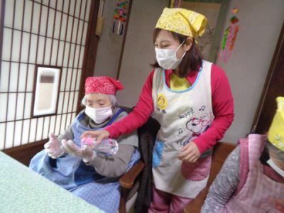 マスク、手袋を装着