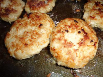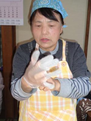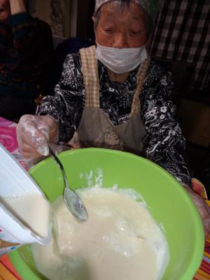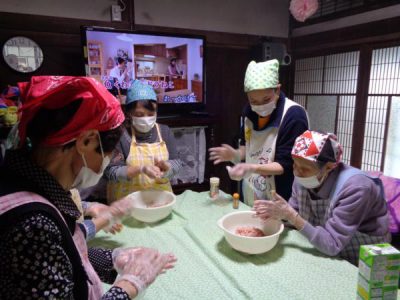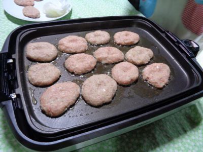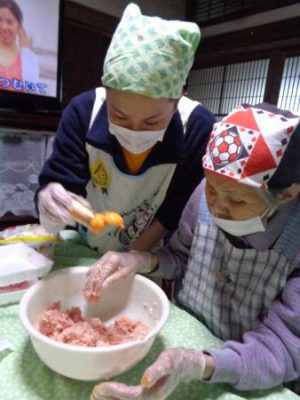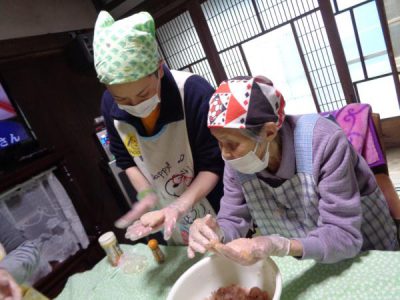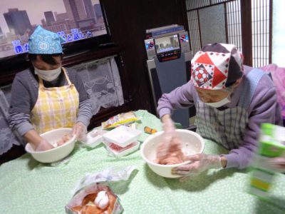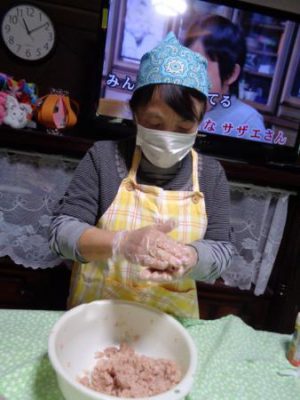 母たちはお肉をこねてますよ