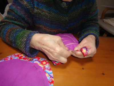縫ったのをひっくり返して、紐を通して完成になりますね