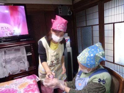 三角巾・エプロン手袋・マスクで身支度を整え・・・