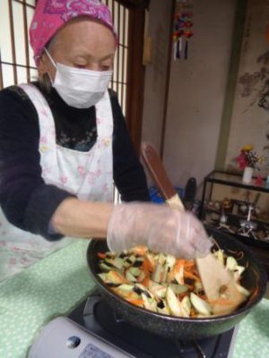 こちらの母達はフライパンで炒めたり、