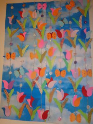 背景の上から、チューリップ、蝶々の吊るしを