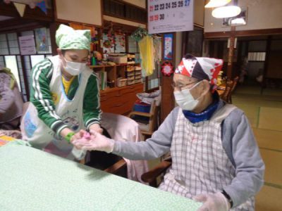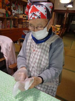 エプロン・三角巾・手袋・マスクをつけ