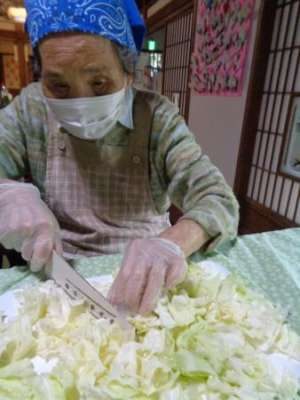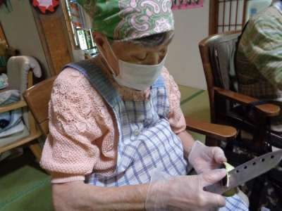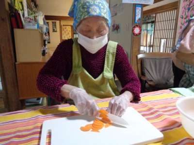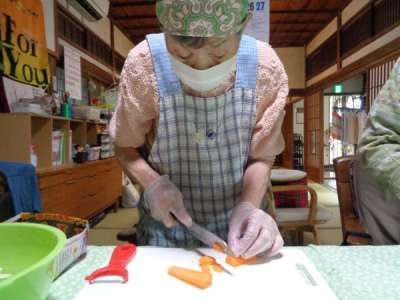 早速野菜を手際よく切って下さる母達美容院 (鋏)