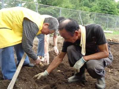 とったじゃがいもを手に記念撮影手 (チョキ)カメラ