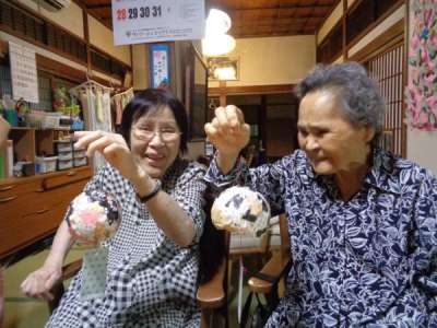 風鈴飾りを作って風鈴に糸を通していきます