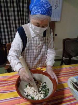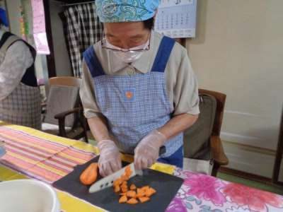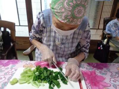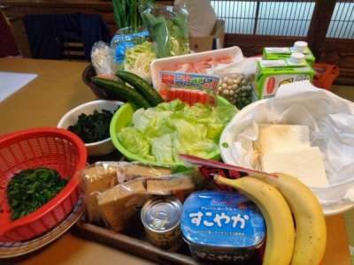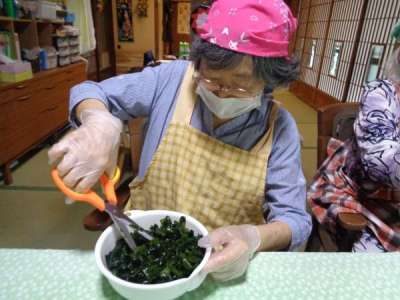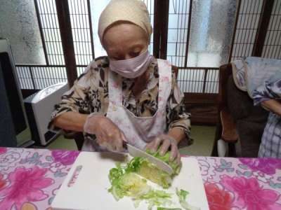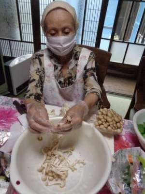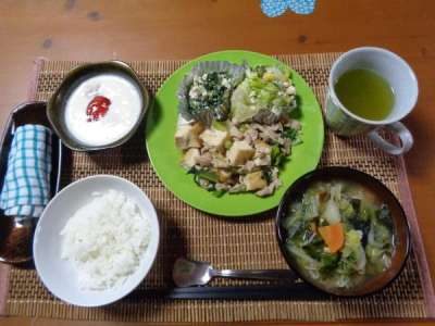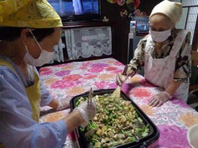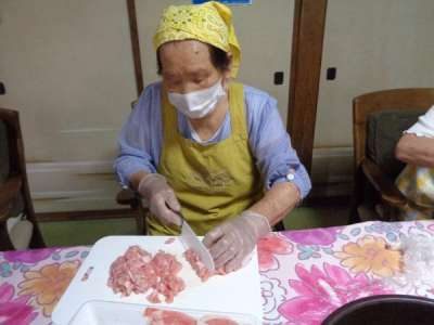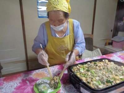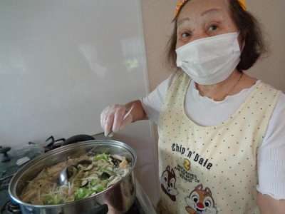 豚肉、小松菜・厚揚げを仲良く炒めて下さる母たち