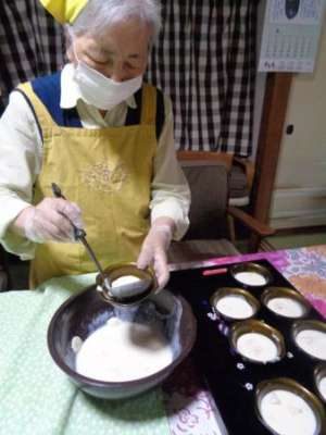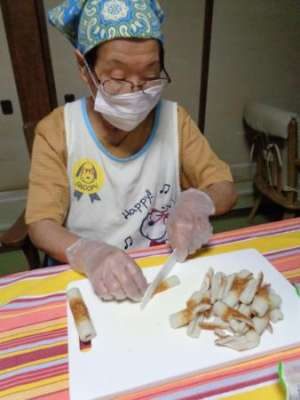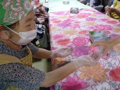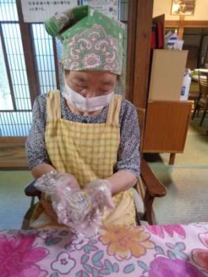 エプロン・三角巾・手袋・マスクをつけて
