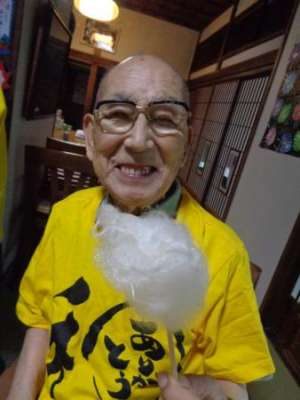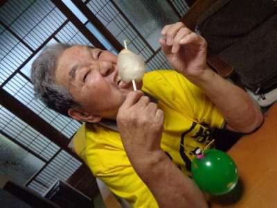 出来立てのわたあめに早速パクっつく父うまい! (顔)ひらめき