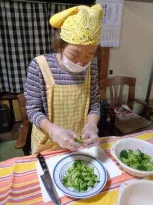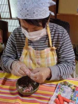 カニカマやブロッコリーを手で細かくさいたり・・・