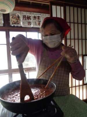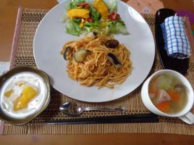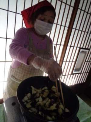 母、フライパンでナスを炒めていますexclamation
