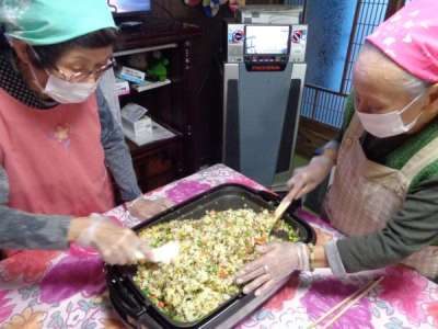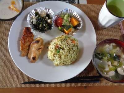 細かく切った食材とご飯をホットプレートでよーく炒めます🍳