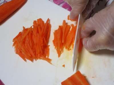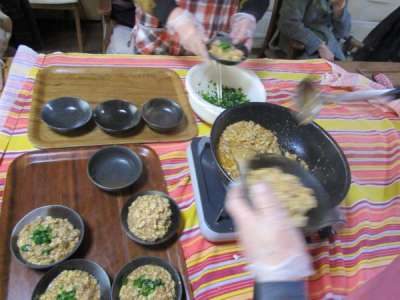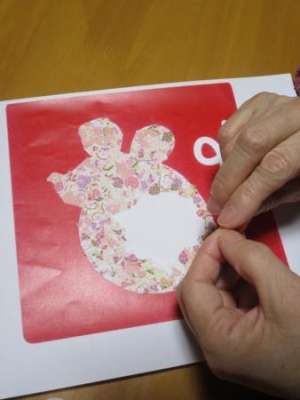 細かくちぎり枠の周りから丁寧に貼り付けていく母