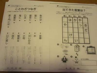 ことわざの点つなぎや言葉の穴埋め、塗り絵を