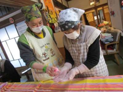 エプロン・三角巾・手袋・マスクをつけて・・・