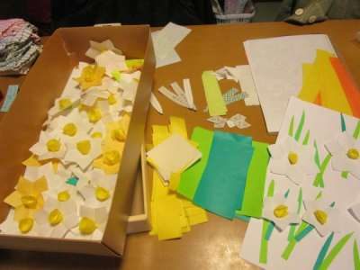 折り紙を折ってスイセンの花や葉っぱの型取りをします