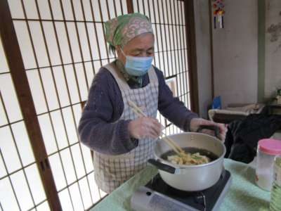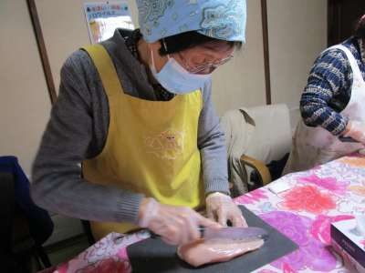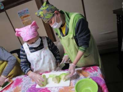 母の指導によりキャベツを切る池ちゃんウィンク