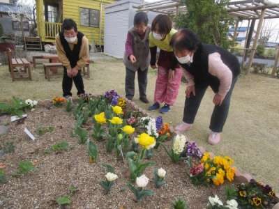 皆さん八重のチューリップに興味津々
