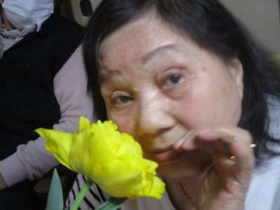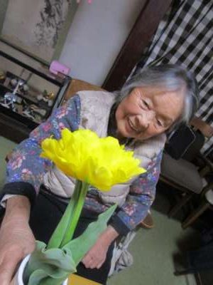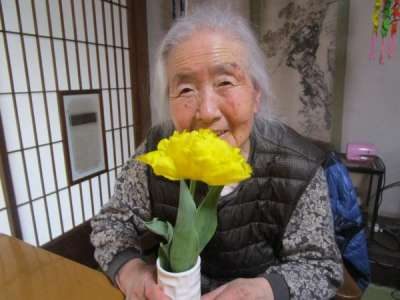 母と二人でチューリップをのぞき込んでいました