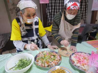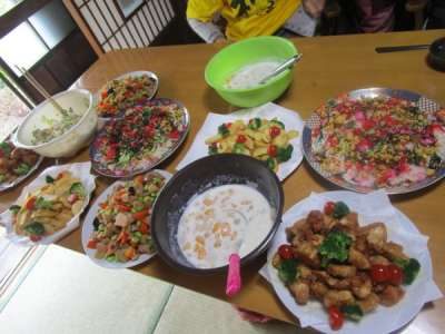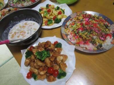 ちらし寿司、唐揚げ、ポテトフライ、煮物、サラダ