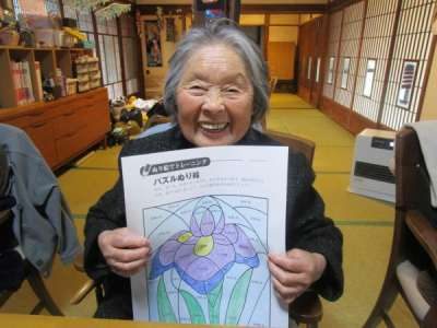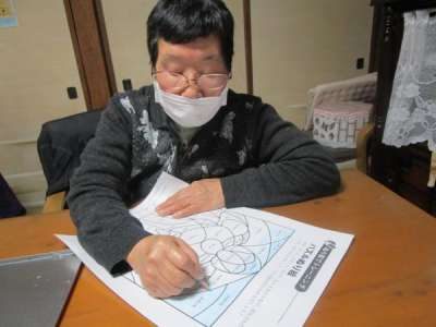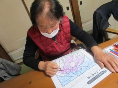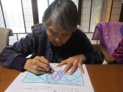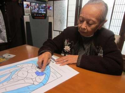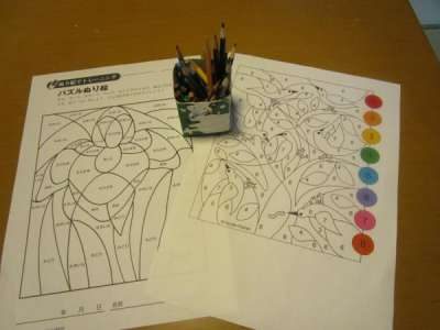 青、黄色、水色、緑、紫の5色で、指定されたところを塗っていきます