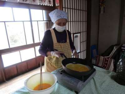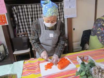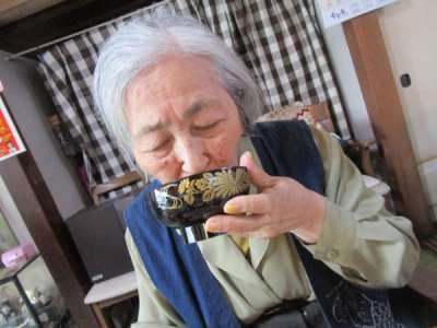 旬の野菜をふんだんに使った味噌汁を飲む母