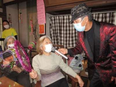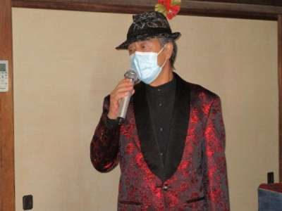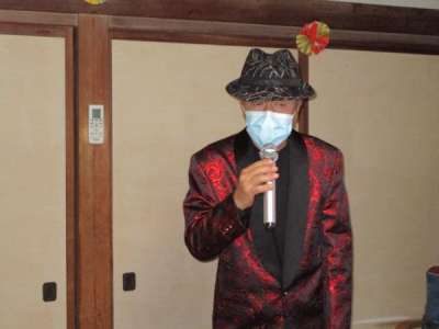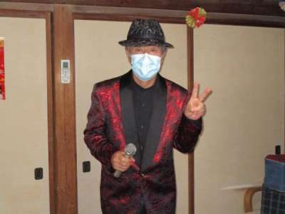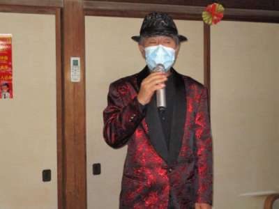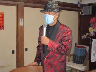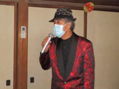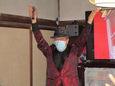 コロナウイルス感染予防の為マスクをしてのオーナーの歌謡ショー