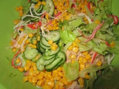 レタス・きゅうり・ツナ・コーン・カニカマをまぜて