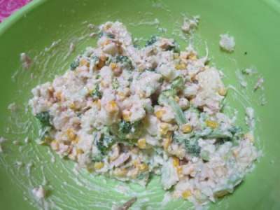 コーン・ツナ・枝豆を入れてポテトサラダ作り