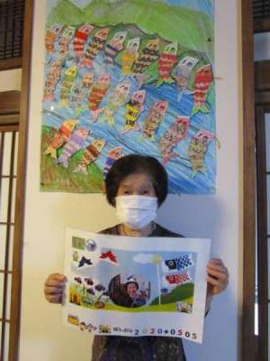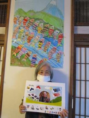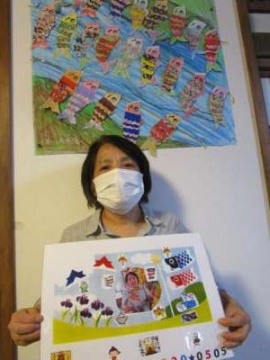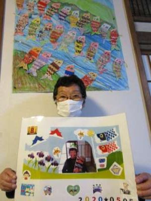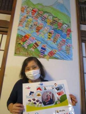 鯉のぼりの壁画の前でみなさん自作の