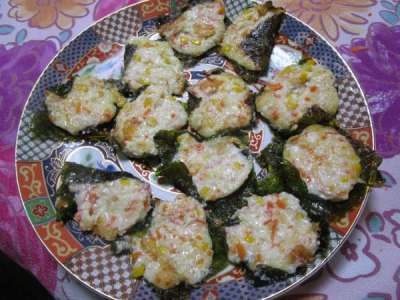 焼きのりのうえにタネをのせて