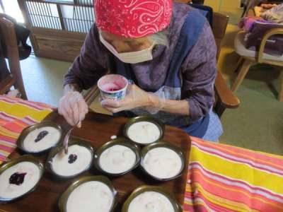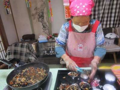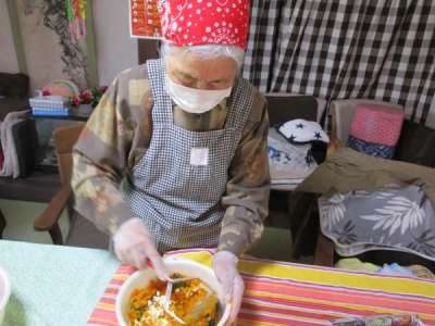 カボチャやゆで卵をマッシュしてカボチャサラダ作り